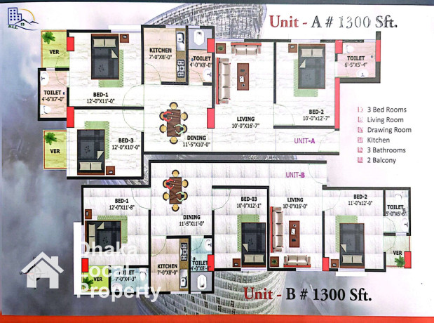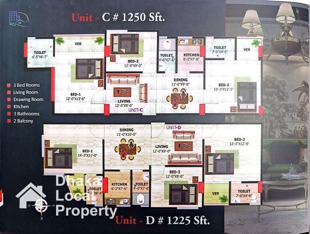 * ফ্ল্যাট সাইজ : টাইপ: এ - ১৩০০ বর্গফুট, বি- ১৩০০ বর্গফুট , সি - ১২৫০ বর্গফুট ডি -১২২৫ বর্গফুট, ই- ১২৬০বর্গফুট